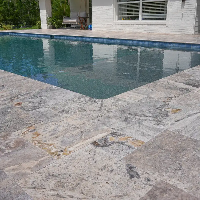 The Silver Tumbled 16×24 Travertine Paver brings cool gray and silver-beige tones to patios, pool decks, and walkways. Its tumbled finish adds a weathered look and natural traction. As a result, your outdoor surfaces feel both refined and safe.